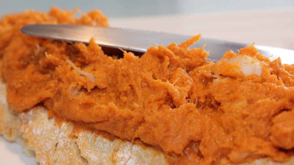 Elaboración de la Miga: En un recipiente, la miga de pan se mezcla con pimentón (que le da su característico color rojizo) y ajos previamente molidos. Se mezcla todo concienzudamente.