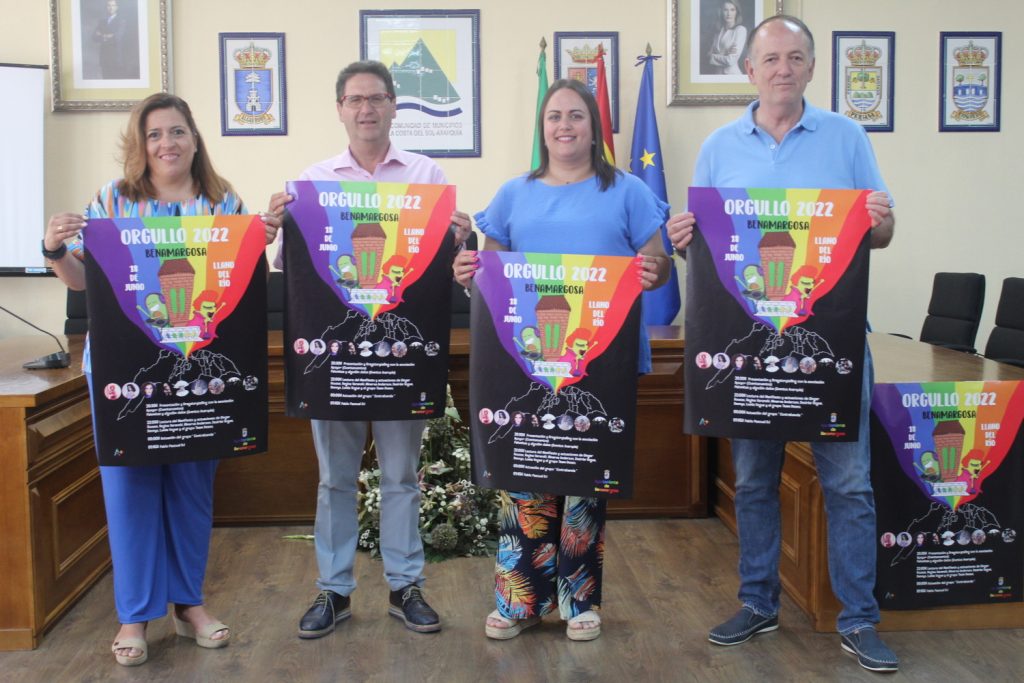 El vicepresidente de la Mancomunidad de Municipios de la Costa del Sol Axarquía, Juan Peñas, la vocal de Igualdad, Aroa Palma, el portavoz institucional, Antonio Sánchez y Mar Carmen Jaime, concejal de Igualad del Ayuntamiento de Benamargosa han presentado esta mañana “Orgullo 2022”, una jornada reivindicativa y lúdica que tendrá lugar este sábado 18 de junio en el Llano del Río de este municipio axárquico.