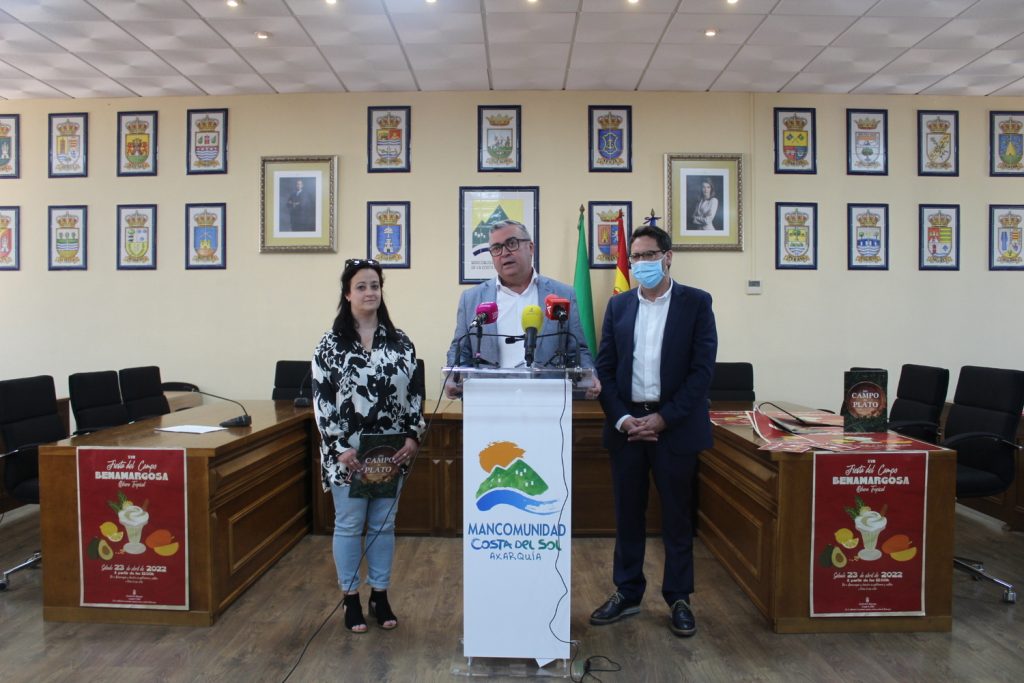 El presidente de la Mancomunidad de Municipios de la Costa del Sol Axarquía, José Juan Jiménez; el portavoz institucional, Antonio Sánchez; y la vocal de Turismo del Ayuntamiento de Benamargosa, Isabel Arcas, han presentado esta mañana la XVII edición del Día del Campo que tendrá lugar este sábado 23 de abril