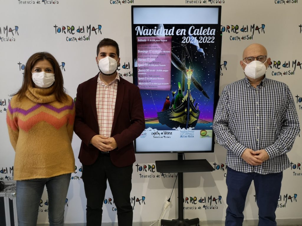 El primer teniente de alcalde del municipio de Vélez-Málaga, Jesús Pérez Atencia; el teniente de alcalde de La Caleta de Vélez, David Segura; y Carmen Soler, representante de la junta de festejos ‘Algarabía’, han presentado en la mañana de este martes el programa de actividades de Navidad del pueblo de La Caleta, que arranca este sábado con la presentación del Belén, el encuentro de coros y la exposición de dibujos escolares.