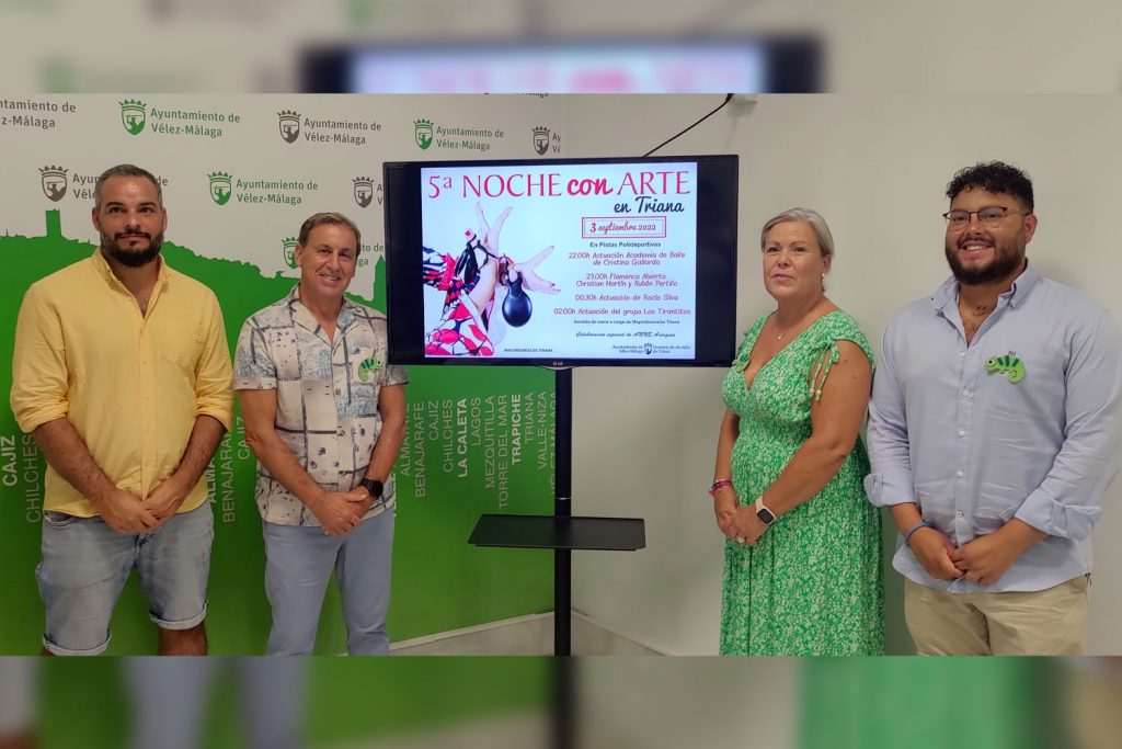 Triana celebrará, el próximo sábado 3 de septiembre, la quinta edición de la ‘Noche con Arte’, con una variada programación de espectáculos musicales que tendrán lugar en el Polideportivo Municipal de la localidad el próximo 3 de septiembre; según explicaron la teniente de alcalde, Lola Gámez, el Mayordomo de la Junta de Festejos de Triana, Alejandro Murillo, el director de Anne-Axarquía, Daniel Jiménez y su presidente Francisco Escamilla.
