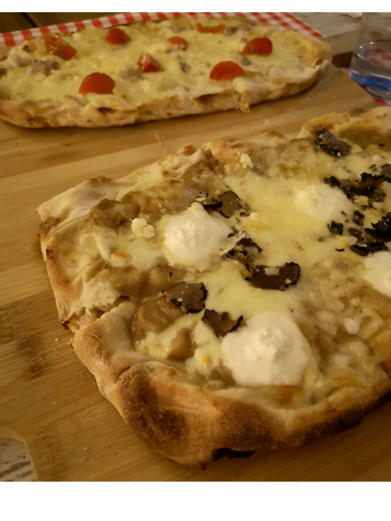 De principal, dos pinsas: Fabio y Tartufata, a cada cual más sabrosa y a la vez ligera. Para los amantes del queso una delicia, y para los que no lo son tanto como yo, al ser tan suave y nada pesado, se aprecia una buena combinación con los demás ingredientes.