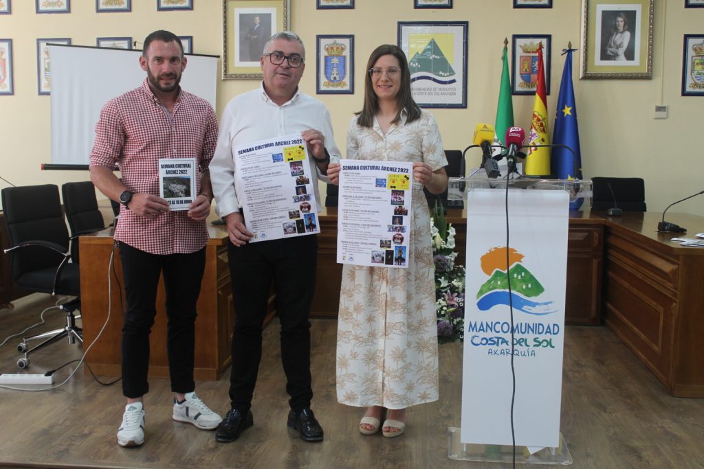 El presidente de la Mancomunidad de Municipios de la Costa del Sol Axarquía, José Juan Jiménez, la alcaldesa de Árchez, Mari Carmen Moreno y el teniente alcalde, Rubén Ariza, han presentado esta mañana la Semana Cultural 2022 que arrancará el próximo lunes 13 de junio y culminará el sábado 18 con la celebración del ‘Día del Corpus’
