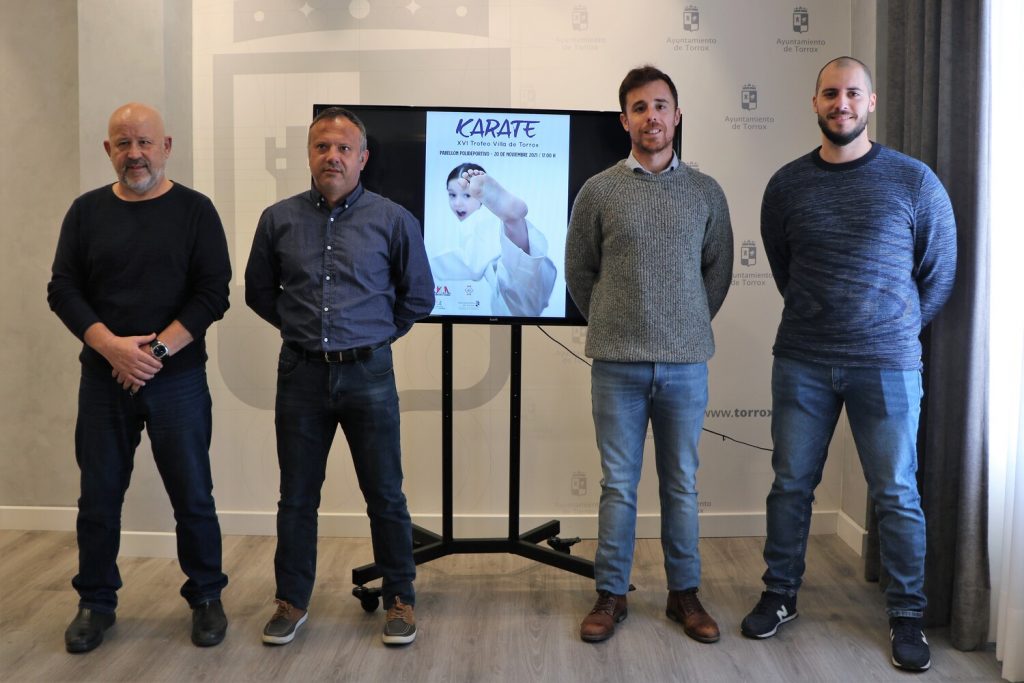 El concejal de Deportes, José Manuel Fernández, junto a Juan Miguel Gallardo, presidente de Asociación Karate Axarquía (AKA); Miguel Ángel Atencia, presidende del club Shotokan Torrox, y Javier Fenech, vicepresidente y profesor del club, han presentado este campeonato en el que todos han coincidido de calificar como familiar.