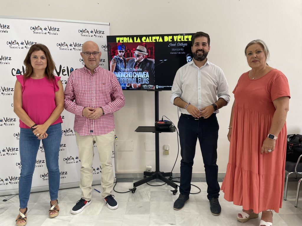 El primer teniente de alcalde del municipio de Vélez-Málaga, Jesús Pérez Atencia; el teniente de alcalde de La Caleta de Vélez, David Segura; la concejala de Ferias y Fiestas, Lola Gámez; y Carmen Soler, representante de la Junta de Festejos ‘Algarabía’, han presentado en la mañana de este jueves el programa de la Feria de la Caleta de Vélez 2022, que contará con las actuaciones de Moncho Chavea & Original Elías, además de José Ortega ‘Manzanita’.
