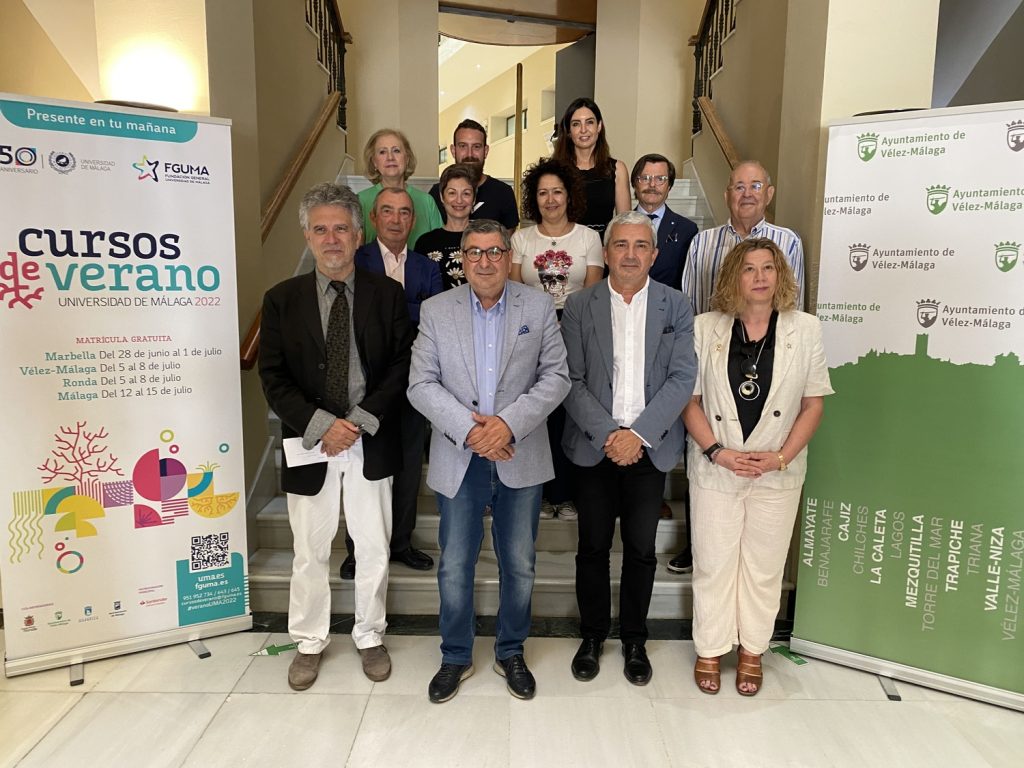 El alcalde de Vélez-Málaga, Antonio Moreno Ferrer, la concejala de Cultura, Cynthia García, el director de la Fundación General de la UMA, Diego Vera, la directora de la Escuela de Doctorado de la UMA, Magdalena Mª Martín, y Silvia Casas, relaciones institucionales de Lundbeck, además de algunos directores de los cursos, presentaron esta nueva edición de los cursos, que este año cumplen su vigésima edición coincidiendo con el 50 aniversario de la Universidad de Málaga.