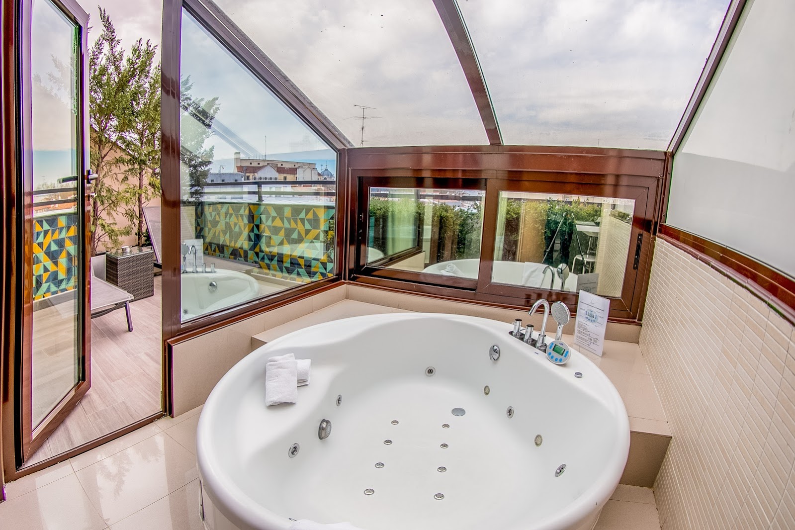 Pero, ¿y la joya de la corona? Las habitaciones con bañera hidromasaje y terraza amueblada con increíbles vistas panorámicas hacia el Palacio Real, el Madrid antiguo, la sierra de Madrid, el pulmón de la Casa de Campo y el pleno Corazón de la Ciudad.