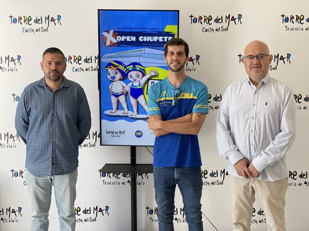 El primer teniente de alcalde del municipio de Vélez-Málaga y teniente de alcalde de Torre del Mar, Jesús Pérez Atencia, junto al concejal de Deportes, Hipólito Gómez y Antonio Díaz ‘Cani’, del cuerpo técnico del Club Natación Axarquía, han presentado en la mañana de este martes la décima edición del Open Chupete de Natación, q ue se celebrará este sábado, 11 de mayo, en la piscina cubierta ‘Eduardo J. Hernández’ de Torre del Mar.