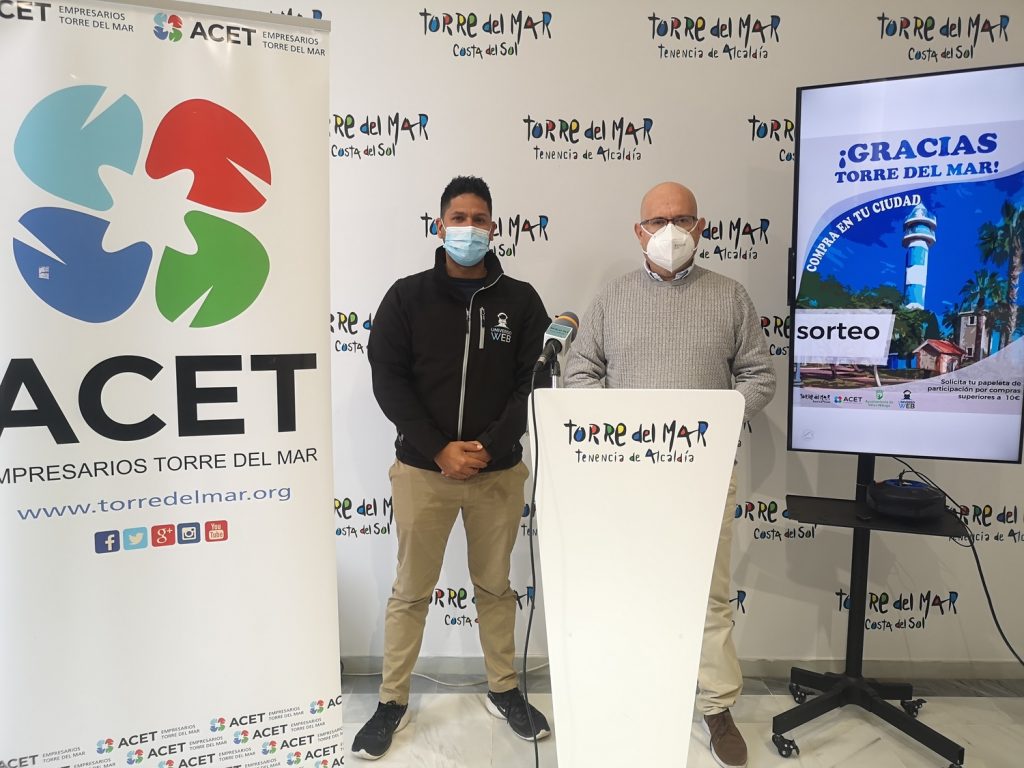 El primer teniente de alcalde del municipio de Vélez-Málaga y teniente de alcalde de Torre del Mar, Jesús Pérez Atencia, junto al vocal de comunicación de la Asociación de Empresarios y Comerciantes de Torre del Mar, Julián Betancur, han presentado la segunda edición de la campaña ‘¡Gracias, Torre del Mar!’ para el apoyo y dinamización del comercio local.