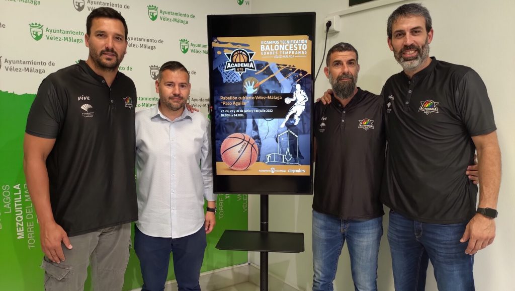 El concejal de Deportes, J. Hipólito Gómez, y el ex jugador del Unicaja y campeón del mundo con la Selección Española de Baloncesto, Berni Rodríguez, acompañados de otros jugadores profesionales y entrenadores del campus, explicaron que el curso está dirigido a los clubes de baloncesto locales, aunque dispondrá de un cupo de plazas para otros usuarios interesados. Se impartirá del 27 de junio al 1 de julio en el pabellón municipal de Vélez-Málaga, ‘Paco Aguilar’. La formación será desarrollada junto a ‘Academia 675’, la entidad deportiva que regenta Rodríguez y dispone de un equipo técnico de máximo nivel en esta disciplina.
