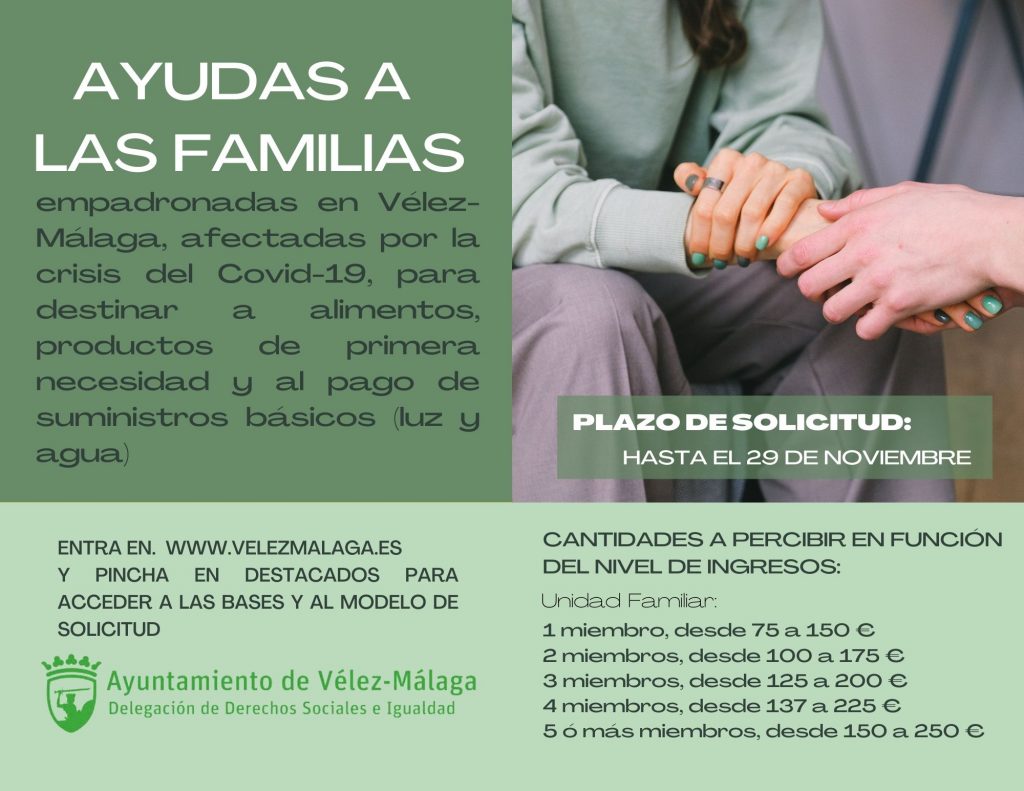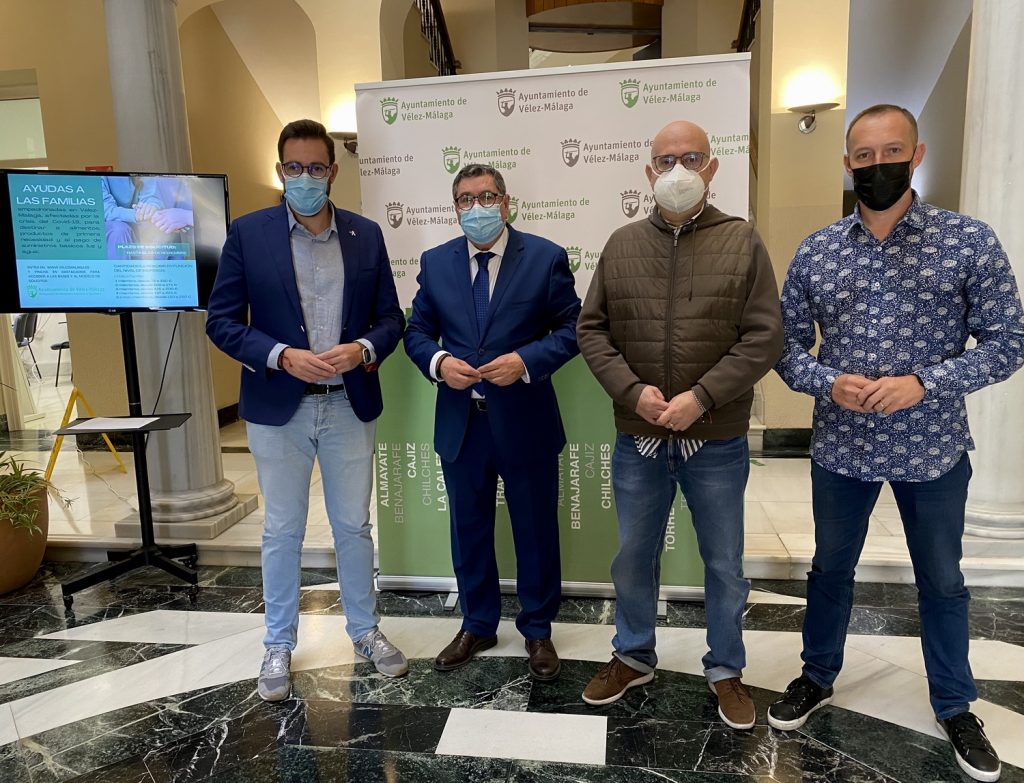 El Ayuntamiento de Vélez-Málaga pone en marcha una nueva línea de ayudas dirigidas a familias en situación de vulnerabilidad económica afectadas por el Covid-19, para las que han destinado 1.750.000 euros, con el fin de ayudarles en el pago de adquisición de productos de primera necesidad y suministros mínimos vitales, como recibos de luz y agua. El plazo para presentar la solicitud está abierto hasta el 29 de noviembre y los requisitos de la convocatoria pueden consultarse en el apartado de destacados de la página web municipal; según explicaron en rueda de prensa el alcalde de Vélez-Málaga, Antonio Moreno Ferrer, el primer teniente de alcalde, Jesús Pérez Atencia, el concejal de Derechos Sociales e Igualdad, Víctor González y el concejal de Hacienda, David Vilches.
