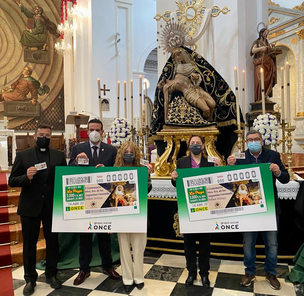 Este miércoles sale a la venta para toda España una edición especial del cupón de la ONCE con la imagen de ‘Las Angustias Coronada’ de Vélez-Málaga, concedida a la cofradía con motivo de su centenario fundacional. Para la presentación en público del cupón, el alcalde de Vélez-Málaga, Antonio Moreno Ferrer, presidió un acto celebrado en la Parroquia de San Juan Bautista, sede canónica de la cofradía, junto con el Hermano Mayor, Jesús D. Gutiérrez, la directora de la ONCE en Vélez-Málaga, M.ª Dolores Pérez, la representante de la ONCE en la provincia, Susana Belén Porras y el vicario parroquial.