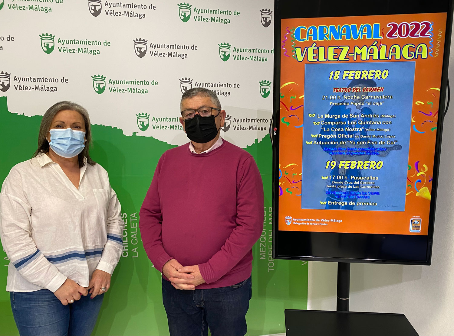 El Ayuntamiento de Vélez-Málaga presentó en la mañana del miércoles la programación del carnaval de 2022, que se retoma tras el parón motivado por la pandemia, y que se va a desarrollar siguiendo las recomendaciones sanitarias vigentes los próximos 18 y 19 de febrero. La concejala de Ferias y Fiestas, Lola Gámez, y el representante de la Peña Axarquía, Manuel Portillo, exlicaron los detalles de las actividades representadas este año por un cartel, obra original de Joaquín Lobato, presentado en el Centro del Exilio el pasado sábado.